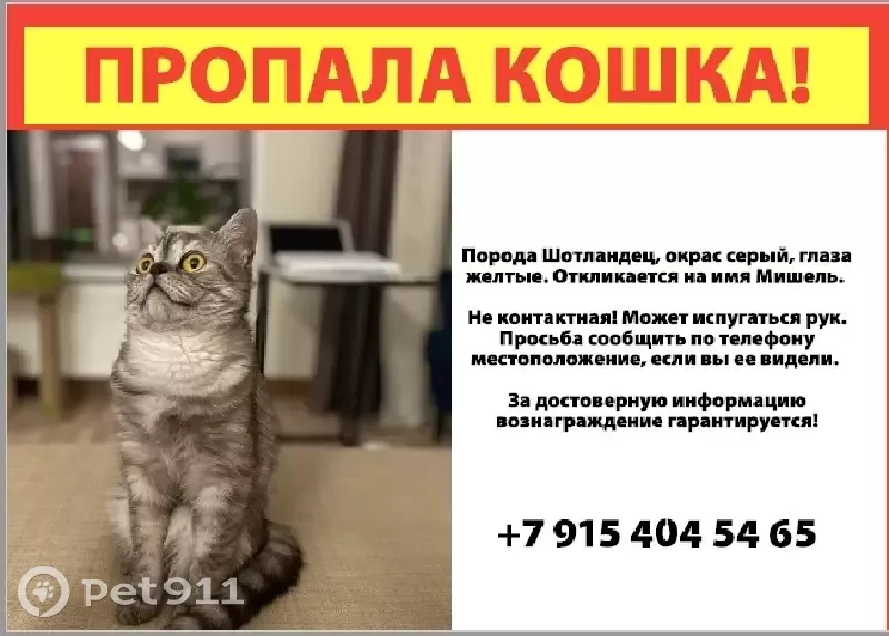 Порода шотландец, окрас серый, глаза жёлтые. Откликается на имя Мишель.
