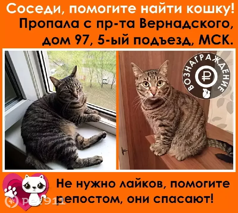 Помогите найти кошку. Просим помощи репостом! Пропала с проспекта Вернадского, дом 97, МСК. Ищем в районе ул. Доктора Гааза. 🐈 29.07.2022 потерялась кошка. - Кличка Муся, 12 лет. - Девочка, метис. - Окрас тигровый. - Брюшко абрикосового цвета в пятнышках.. - Осторожно относится к чужим, но без агрессии. Можно попробовать подозвать или аккуратно приманить едой и придержать в поле зрения или взять к себе, мы максимально быстро приедем за ней. - Пожалуйста, не пытайтесь ловить, если сама не пойдёт в руки, может быть напугана. Позвоните нам, мы объясним как правильно поступить. Если будет возможность отправьте нам фото и местоположение. - Если вы увидите кошку у своих соседей, скажите, пожалуйста, что её ищут и позвоните нам, конфиденциальность и вознаграждение гарантируем. - Если вы приютили нашу девочку, очень просим вернуть, для нас она член семьи. 💰 Вознаграждение: гарантирую вознаграждение любому, кто вернет кошку или сообщит достоверную информацию о её местонахождении, которая приведет к возвращению кошки домой. 🚫 Мошенников просьба не беспокоить. Вознаграждение по факту возвращения кошки домой. 📞 Нашедшим обращаться по тел.: +7 916 544 72 71 / +7 916 567 17 32 WhatsApp: +7 916 544 72 71 Или пишите: vk.com/id401382330