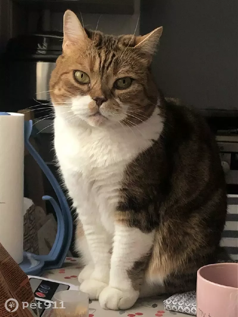 Кошка Плюша, 9 лет. Порода - шотландская прямоухая. Телосложение среднее, полосатая спинка, белая грудка. в районе носика есть отличительное бежевое пятнышко. Чипирована!! Тихая, боязливая, домашняя девочка, никогда не любила бывать на улице. Предположительно, выпала с балкона второго этажа.