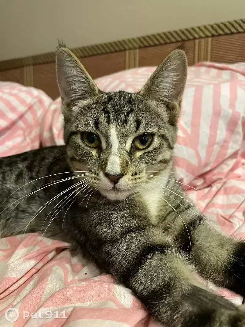 Кошка короткошерстная,возраст 7-8 месяцев,длинные лапы и длинный хвост с белым пятнышком на конце. Окрас бело-серый, с полосочками и пятнами. На носу белая полоска яркая,воротник белый. Выпрыгнула в окно первого этажа