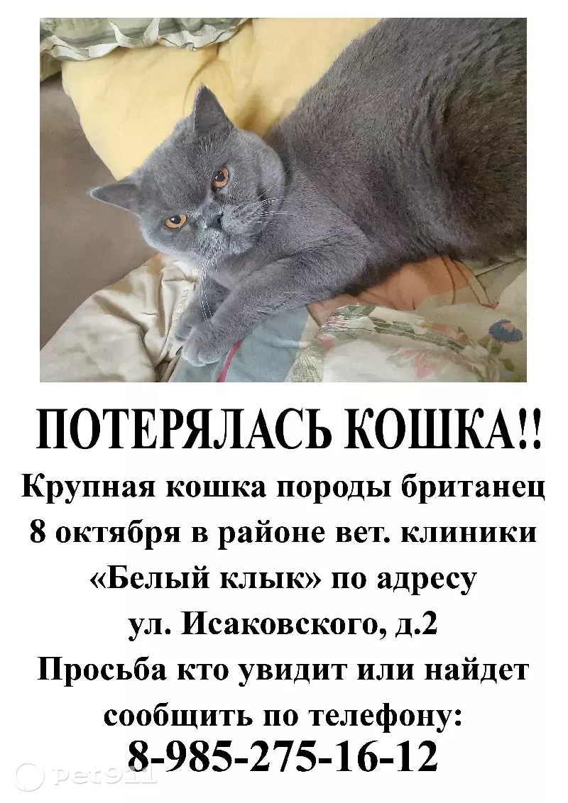 Кошка порода британская, 7 лет, зовут Диана, потерялась напротив ветеринарной клиники Белый Клык Мы все в трауре, это член семьи, на улице она не выживет. Добрые люди, помогите найти кошечку. В долгу не останемся.
