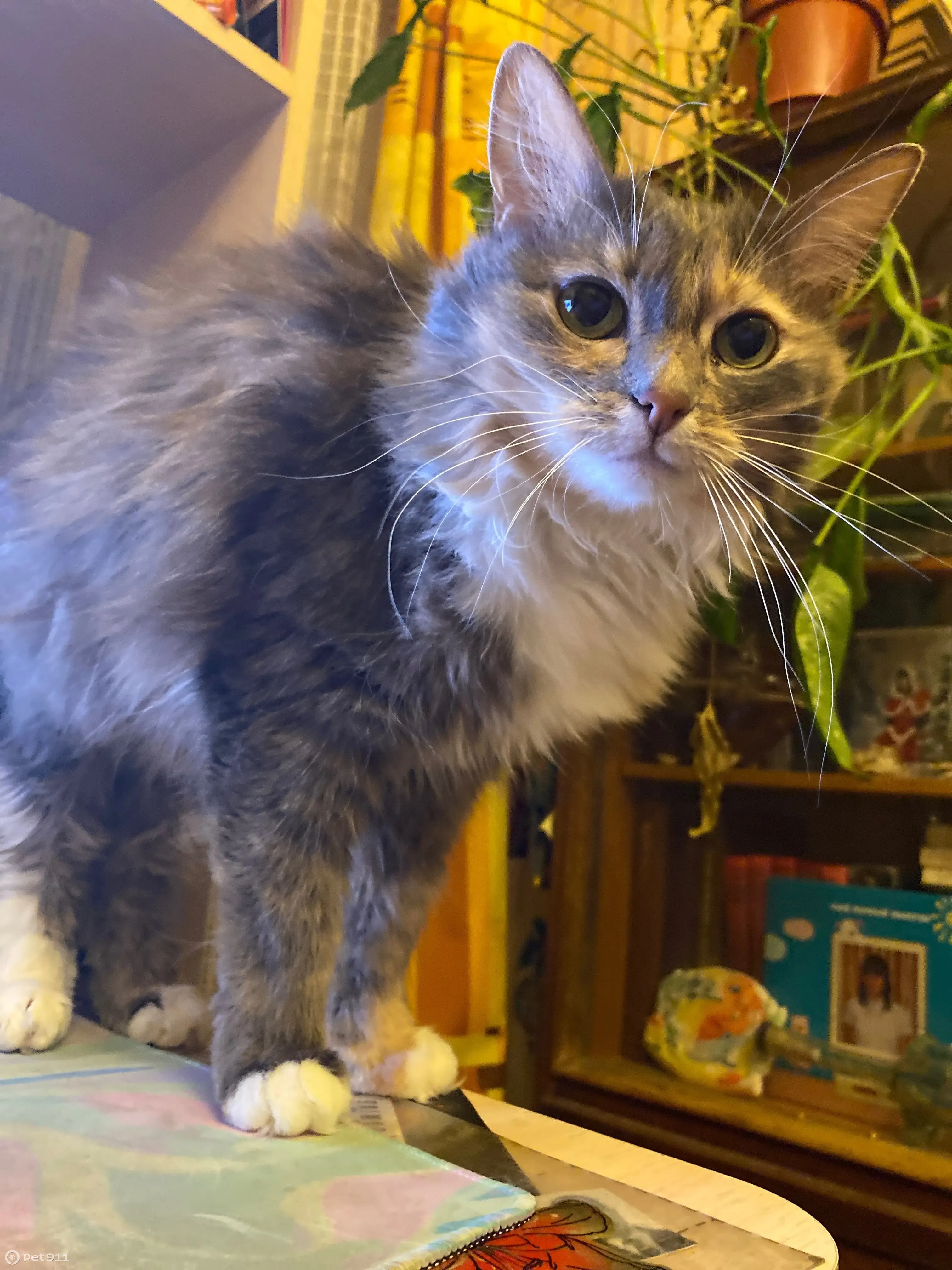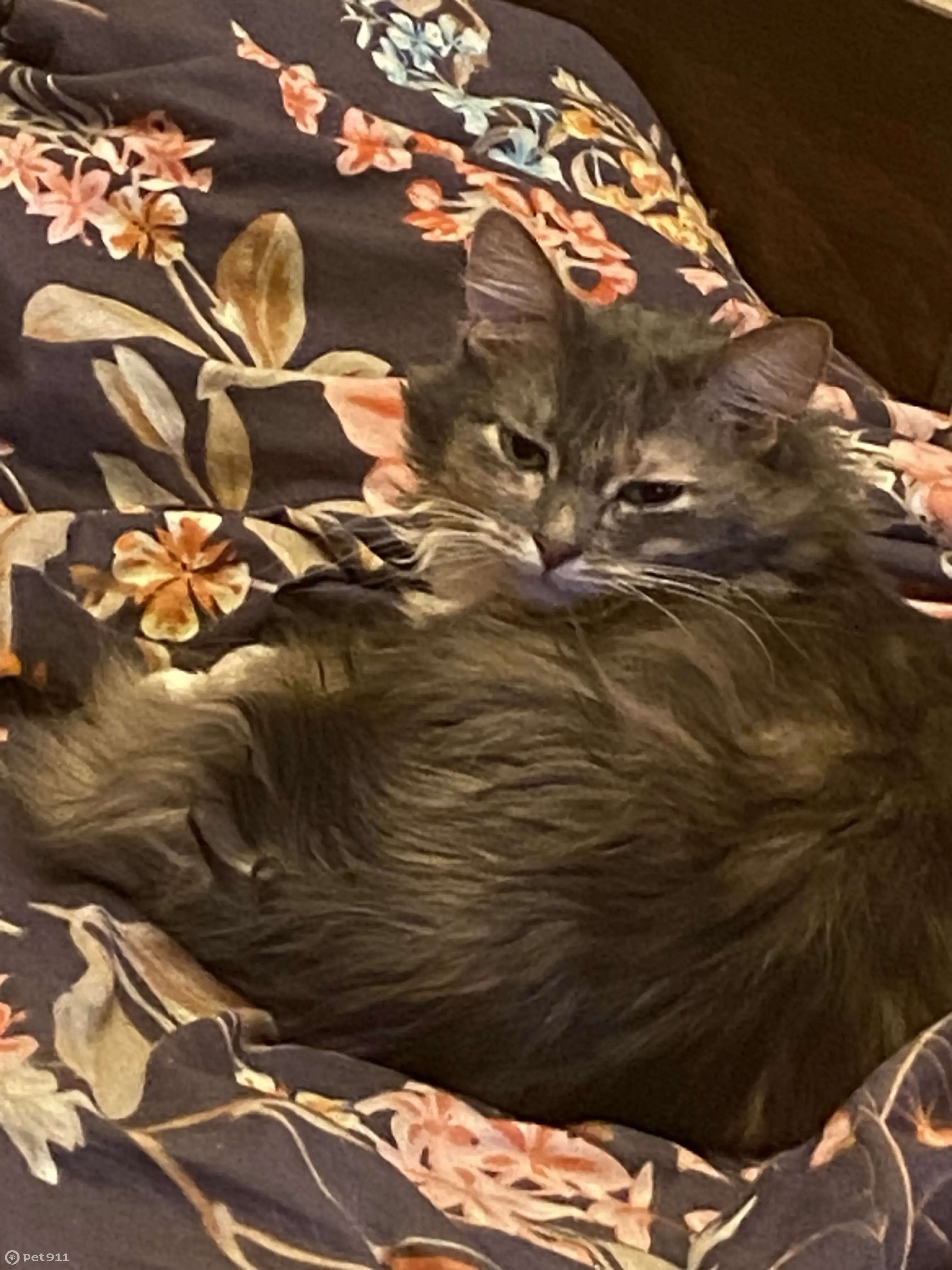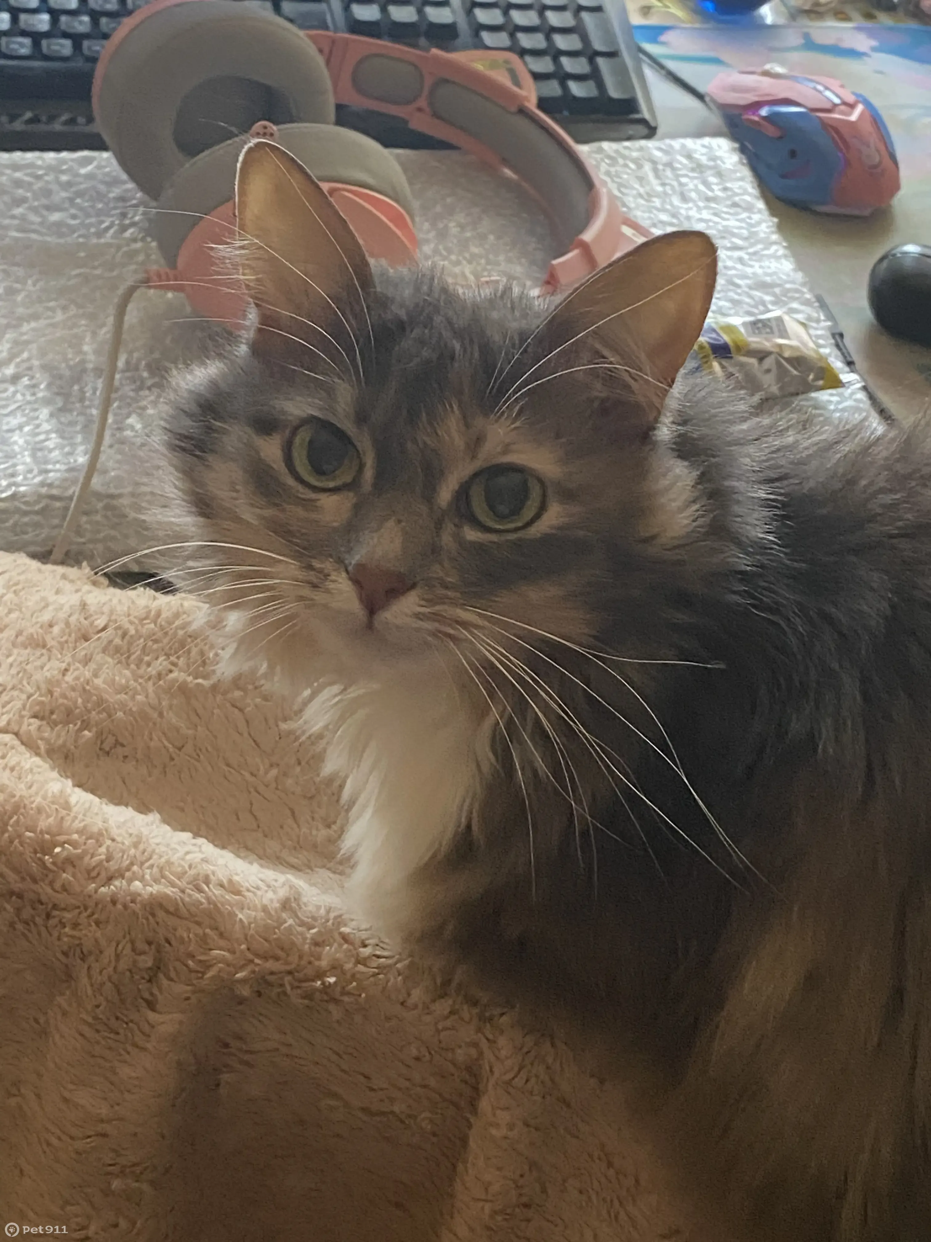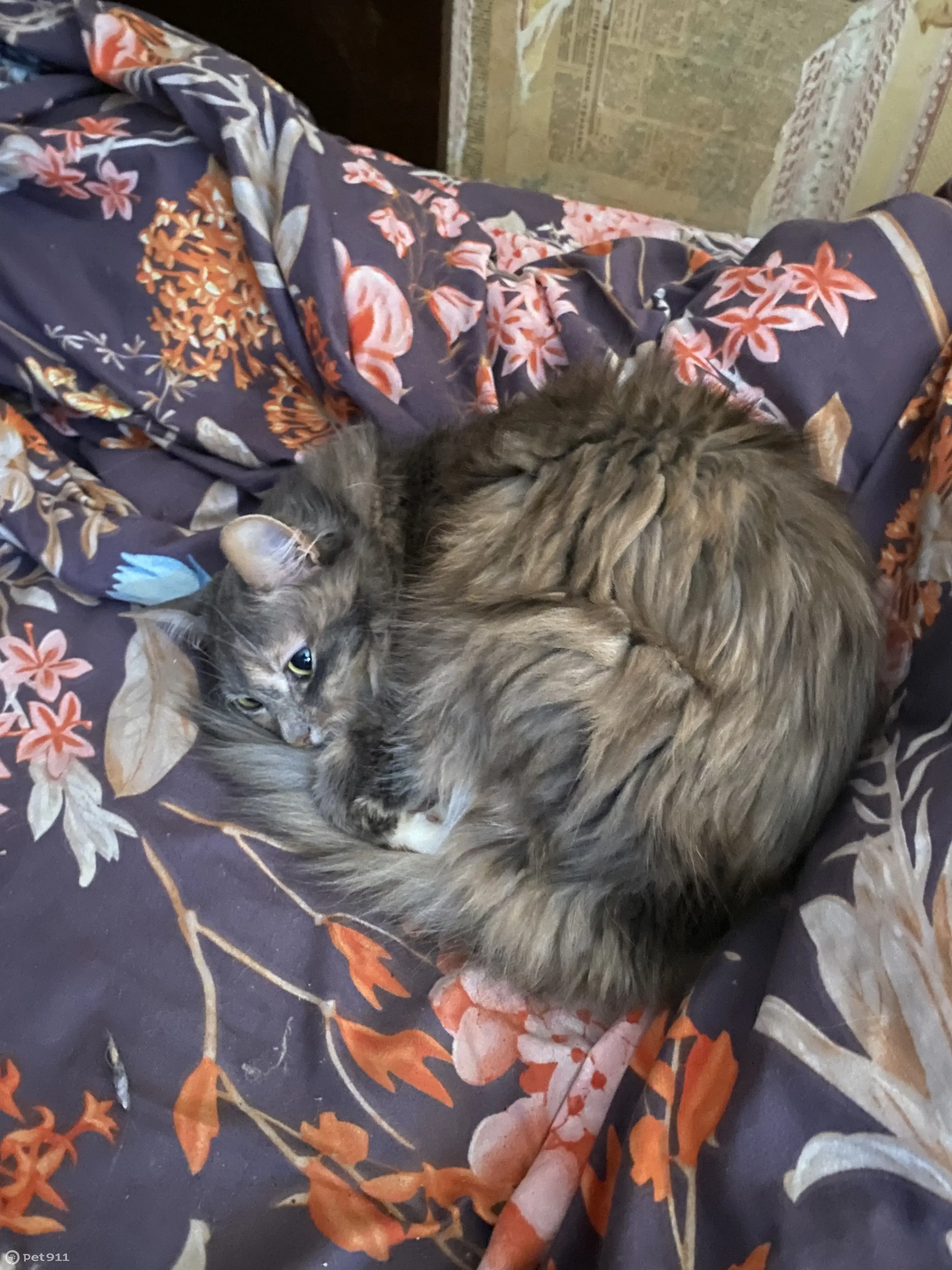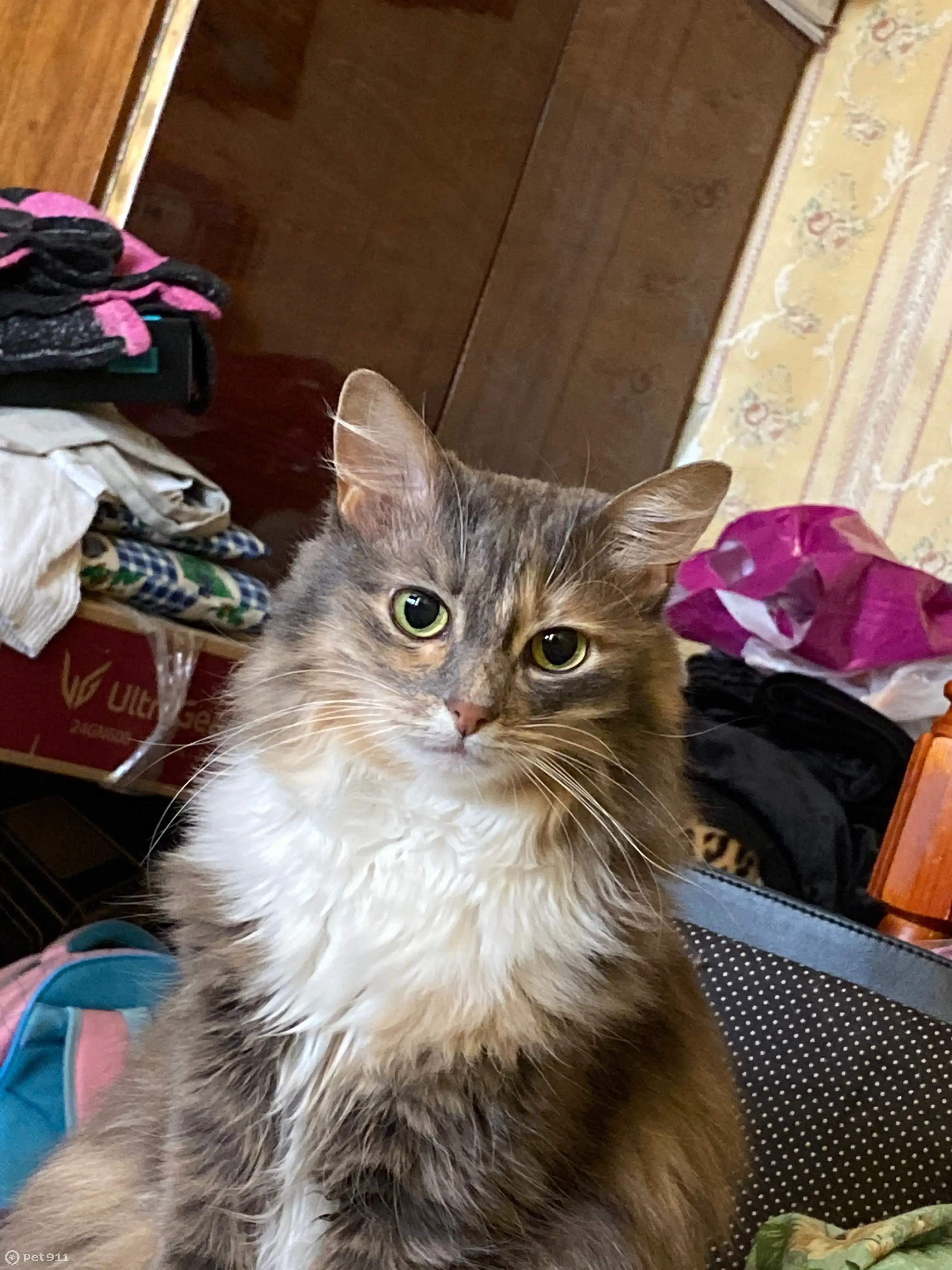 Девочка, Алиса, пушистая с серой шубкой, белые носочки и белое пузико, есть рыжие пятна. 10 лет ей. Кошечка пропала, нигде не нашли - ни дома, ни около. Она очень лаская.
