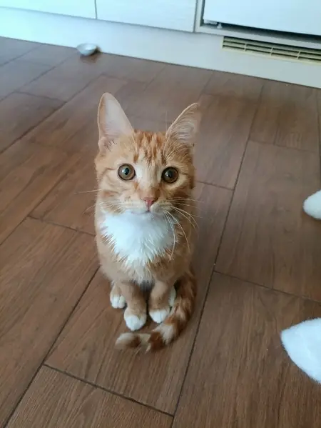 Кот, окрас рыжий, животик белого цвета, так же лапки белые. Цвет глаз зеленый. Предположительно выбежал из квартиры, когда мы выходили и не заметили.