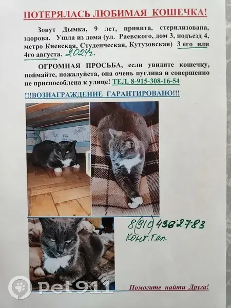 Пропала кошечка, 9,5 лет Темно-серая с белой грудкой,лапки в белых носочках, домашняя,УЛИЦА для нее СТРЕСС.Сбежала либо 3 августа ночью, либо рано утром 4 августа, (окошки на проветривании, дверь).Кошка из другого района.