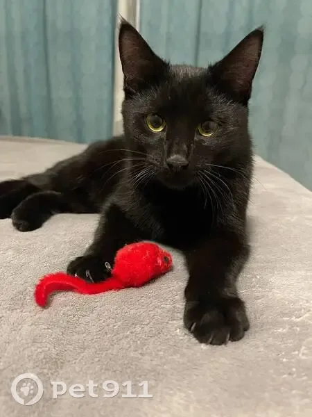 Полностью черная кошка,длинный нос,желтые глаза. Молодая,года полтора-два