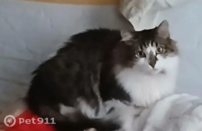 Крупный взрослый кот, вес примерно 5кг, белая грудь и шея, тёмные глаза, очень пушистый хвост. Задние движение ног иксом. Кот доверчивый, но боится резких движений.