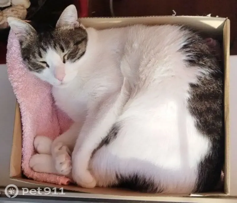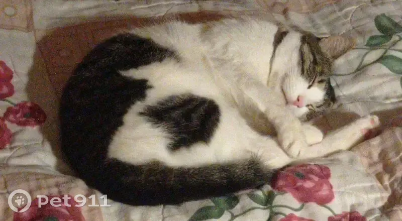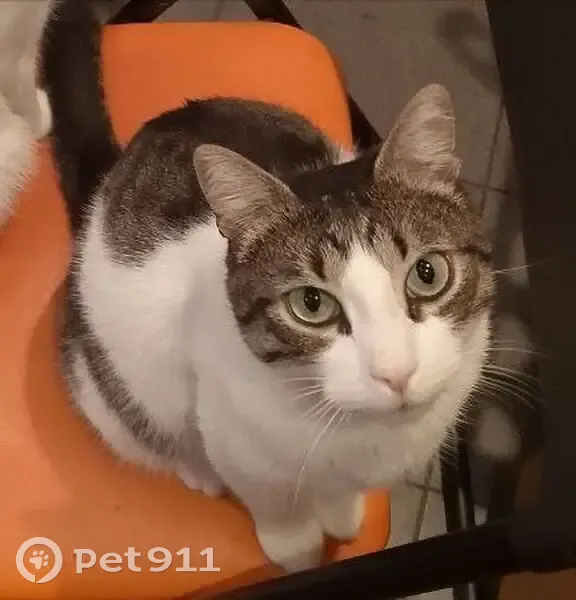 Кот среднего размера, бело-серый, глаза зелёные, зовут Филимон. Есть серо-голубой ошейник с светоотражателями. Скорее всего рано утром выпал с балкона первого этажа