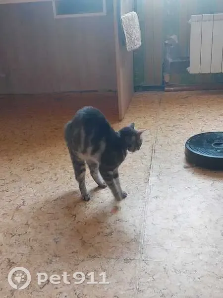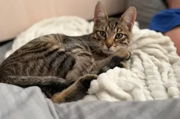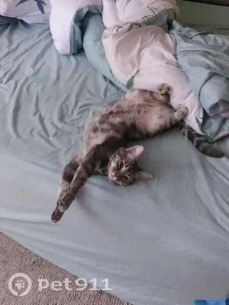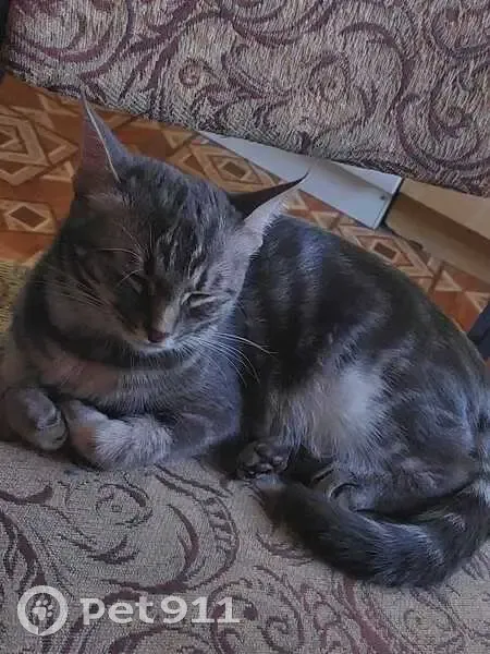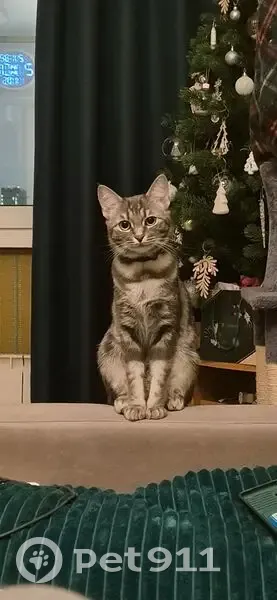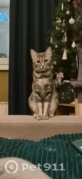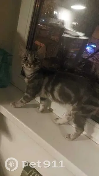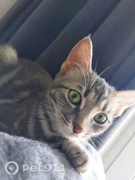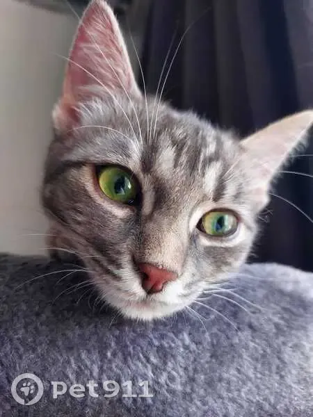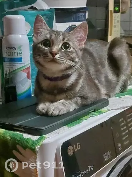 Девочка около года маленькая , цвет серый с переливами, глаза большие зелёные, на ушками кисточки ,на ней был фиолетовый ошейник