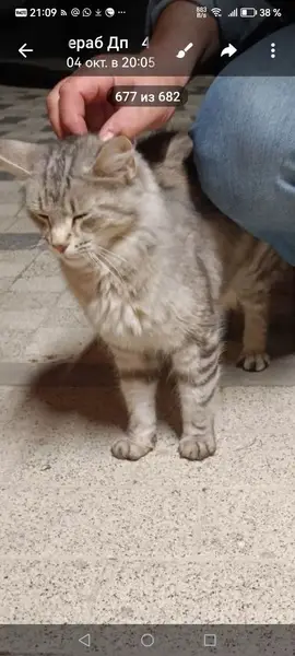 Серый мраморный окрас, достаточно пушистый, зелёные глаза, правое ухо деформировано. Несколько лет жил в частном доме на свободном выгуле, каждый день-два появлялся дома. Ласковый, не пугливый.