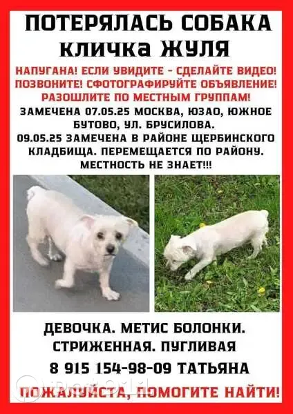 Беленькая болоночка коротко подстриженная. Ехала с мужчиной с Красноярска. Потерялась на ст. Щербинка. Три дня жила во дворе ул. Брусилова д. 15. Домашняя , очень пугливая. Ни к кому не шла и не подпускала. Жильцы дома хотели поймать , но она испугалась и убежала с восьмого числа ничего не знаю о ней. Ездили искали, но нигде нет. Люди добрые помогите пожалуйста! Я человек пожилой ни детей , ни внуков одна радость была это моя Жулечка. Умоляю если кто взял хотя бы сообщите.