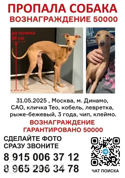 ПОИСКИ ТЕО ПРОДОЛЖАЮТСЯ ️ Пропала собака. 31.05.2025 в 00:10 Москва, САО, ст. М. Динамо ЛЕВРЕТКА, 3 года, мальчик, есть клеймо, чип. ️ МОЖЕТ НАХОДИТЬСЯ В ЛЮБОМ РАЙОНЕ МОСКВЫ И МО Цвет: изабелловый (при разном освещении может казаться: рыжим, песочным, бежевым, кремовым). ️ Особая примета: перебит самый кончик хвоста, выглядит как небольшой бугорок. Видели (предположительно) 12 июня в 22.18 на Московской аллее парка Динамо, бегал между вестибюлями метро . ️ Возможно вы видели похожую собаку в день пропажи или позже, или какое-то происшествие с его участием. ️ Возможно его придержали и не знают о поиске, и вы видите похожую левретку на улице с другими людьми. ️ Возможно взрослый похожий кобель левретка вдруг появился у ваших соседей по дому, по району. По возможности сделайте ФОТО или ВИДЕО. СРАЗУ ЗВОНИТЕ: ️ +79652963478 ️ +79150063712 ️ +79259014116 Ссылка на чат поиска: https://t. Me/+Z11pzc6jW2llMmM6 ️ Мы гарантируем вам анонимность ️