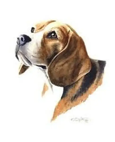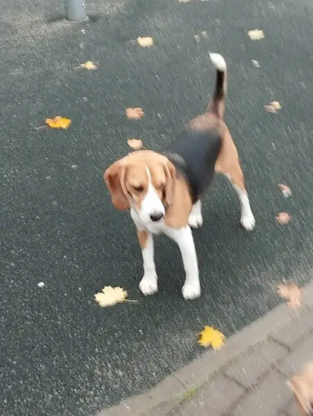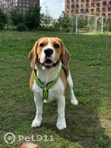 Бигль, триколор. Спина черная, живот белый, по бокам рыжий. Есть пятнышко под носом коричневое. И белое на самом носике Испугался салюта. Есть голубая веревочка для адресника, сам адресник металический косточка Оранжевая шлейка