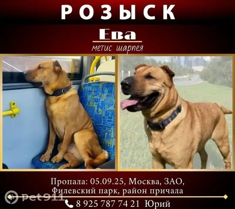 девочка рыжего окраса с короткой шерстью, метис шарпея? Хозяева с ней гуляли на набережной в парке «Фили» 5.09.2025 г. На ней был темно-синий нейлоновый ошейник с черной пластиковой застёжкой. Она внезапно убежала во время прогулки где-то в 18:15 в районе Филёвской набережной около причала, где бассейн. Хозяева гуляли с ней по набережной парка Фили, отпустили около себя, но её что-то видимо испугало, и она сорвалась с места и убежала, вдоль набережной в сторону Крылатского. С тех пор её так и не могут найти.