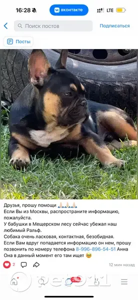Друзья, прошу помощи Если Вы из Москвы, распространите информацию, пожалуйста. У бабушки в Мещерском лесу сейчас убежал наш любимый Ральф. Собака очень ласковая, контактная, безобидная. Если Вам вдруг попадается информацию он нем, прошу позвонить по номеру телефона 8-996-896-54-51 Анна Она в данный момент его там ищет