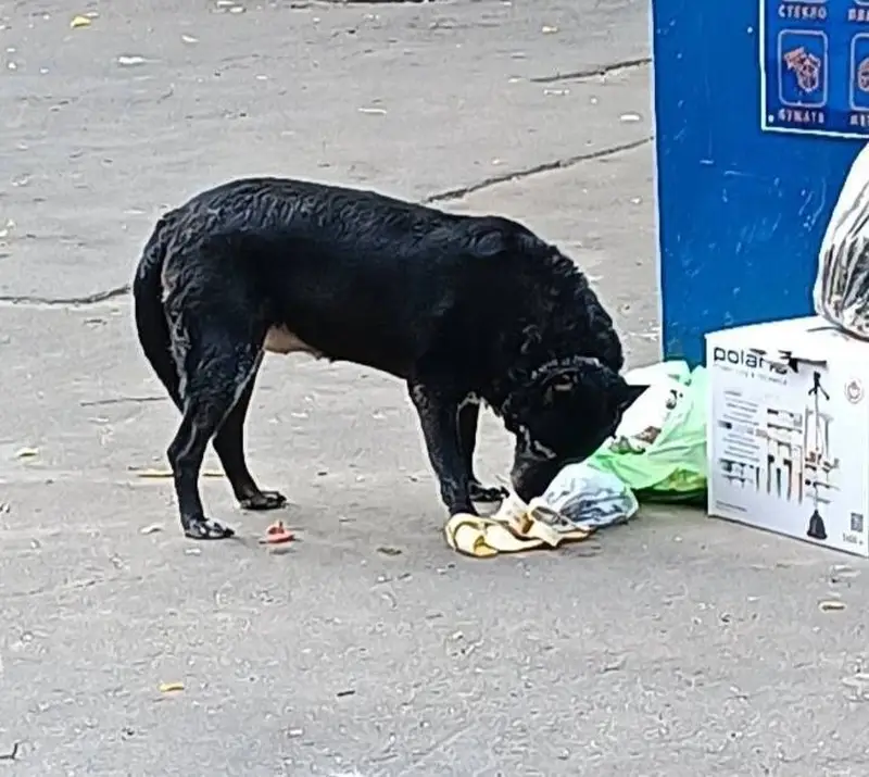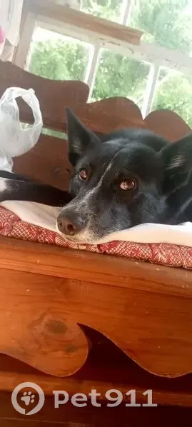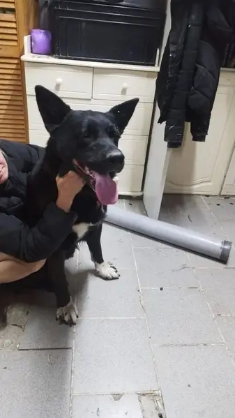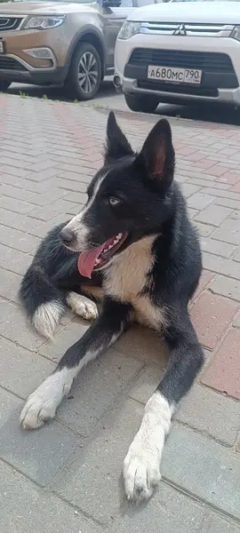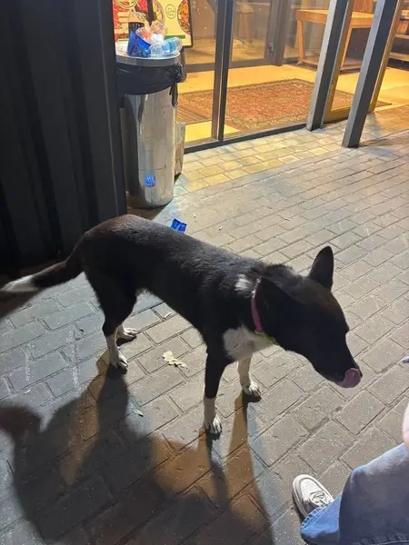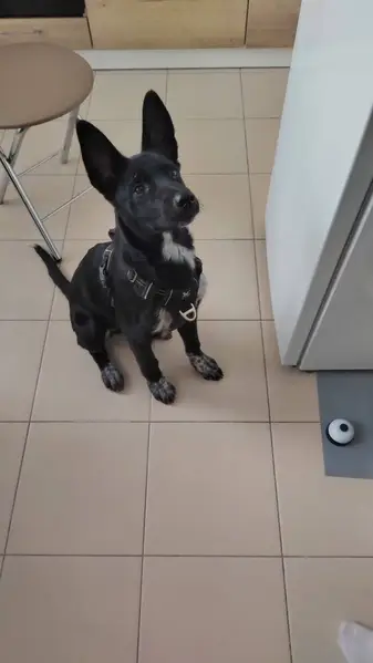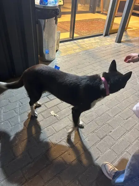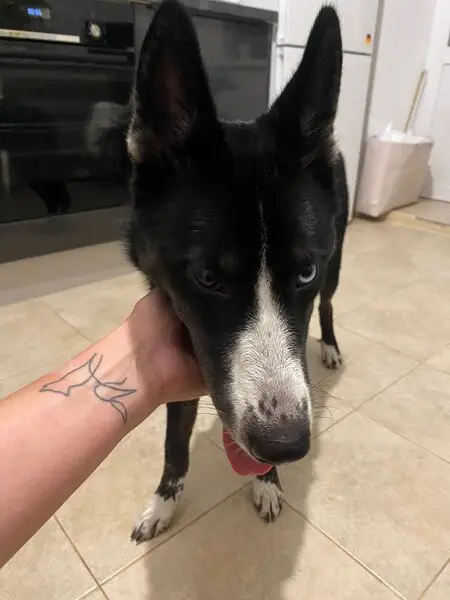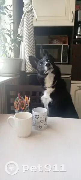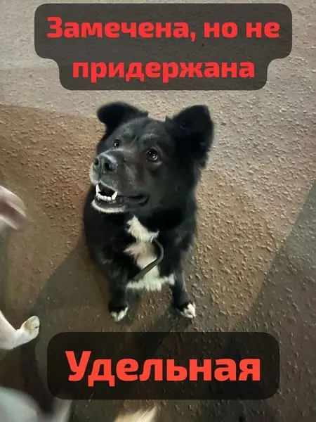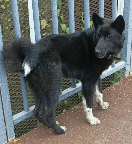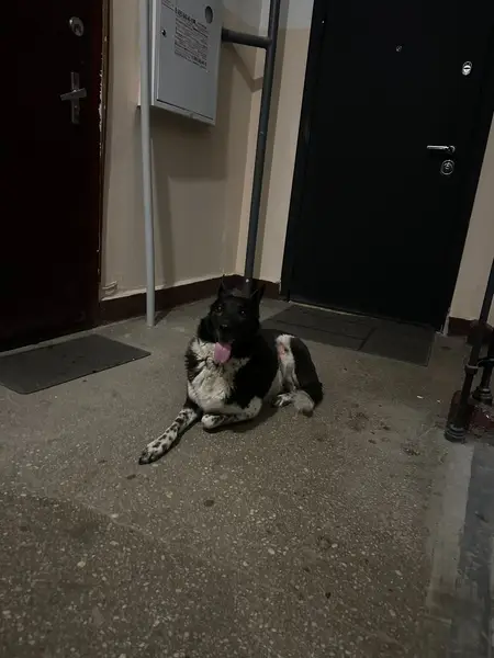 Из особенностей: хвост имеет два загиба. Окрас черный с белым. Человекоориентированная, хоть и большая на вид, но не агрессивная. В кожаном коричневом ошейнике и в сером от блох и клещей