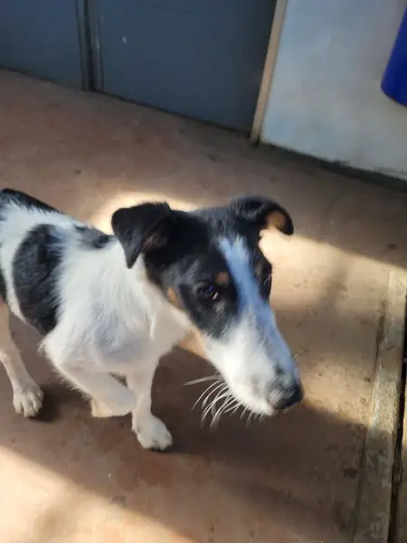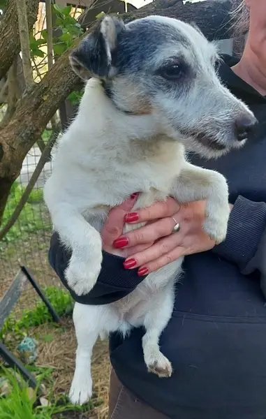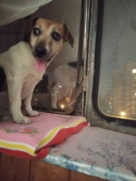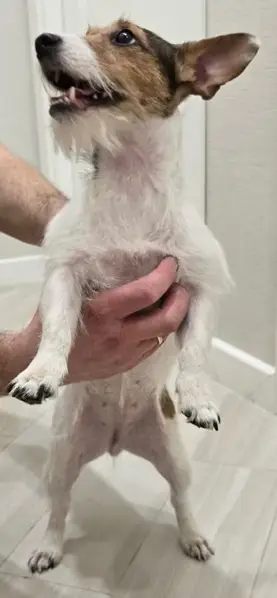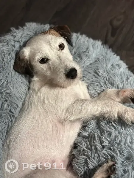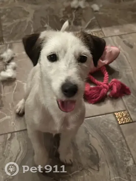 Белая Джек Рассел терьер среднешерстная, с коричневыми ушами, коричневым пятном слева от хвоста. Ошейник с фиолетовым адресником в виде косточки, с номером телефона. Дружелюбная. Любит слово яблочко, вкусняшки