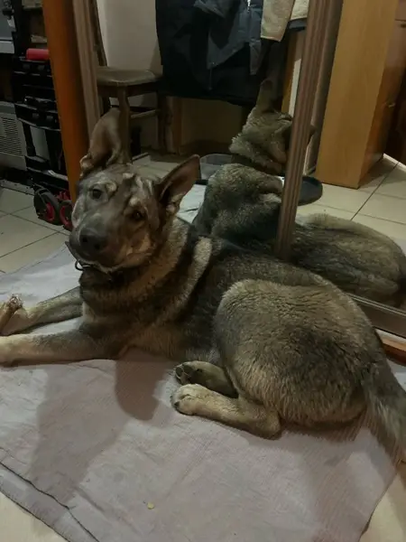 Черный, Тёмно-серый окрас и серый окрас, висячие острые ушки, большие черные глаза, травмированный и перебинтованный хвостик