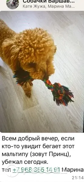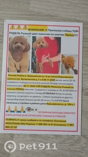 ️ *Пропала собака ТОЙ-ПУДЕЛЬ, Рыжий цвет, кастрированный мальчик, по кличке ПРИНЦ!!!!* Имеет проблемы с ЖКТ, частично побриты передние лапки, так как недавно лечился от обострения! *Москва! Район м. Варшавская ул. 6-ая линия Варшавского шоссе и ул. Артековская д.7 к.4* 08.11.2025 вечер около 20-30 сорвался с поводка, испугался петард, убежал во дворы! Собака приехала из другого города! Искали до 00-30 ночи у ТЦ АНГАРА была замечена у стройки в районе дома Варшавское ш. Д. 100 к.1 *ВОЗНАГРАЖДЕНИЕ!* ВЗЯТЬ В РУКИ И НЕ ОТПУСКАТЬ! СОБАКА В СТРЕССЕ! ПОЙМАТЬ и сразу сообщить по телефону +79518602797 WA (Екатерина) или в группу поиска в телеграмм!! Хозяйка и ее сын его очень любят!!!! Верните, пожалуйста!! Помогите найти!