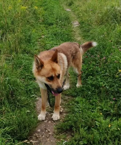 8 лет 28го октября сутра испугалась взрыва и подлезла под оградой вольера Без ошейника Кончики лап и хвоста белые Седой низ морды Могла убежать в лес На контакт не думаю что пойдет