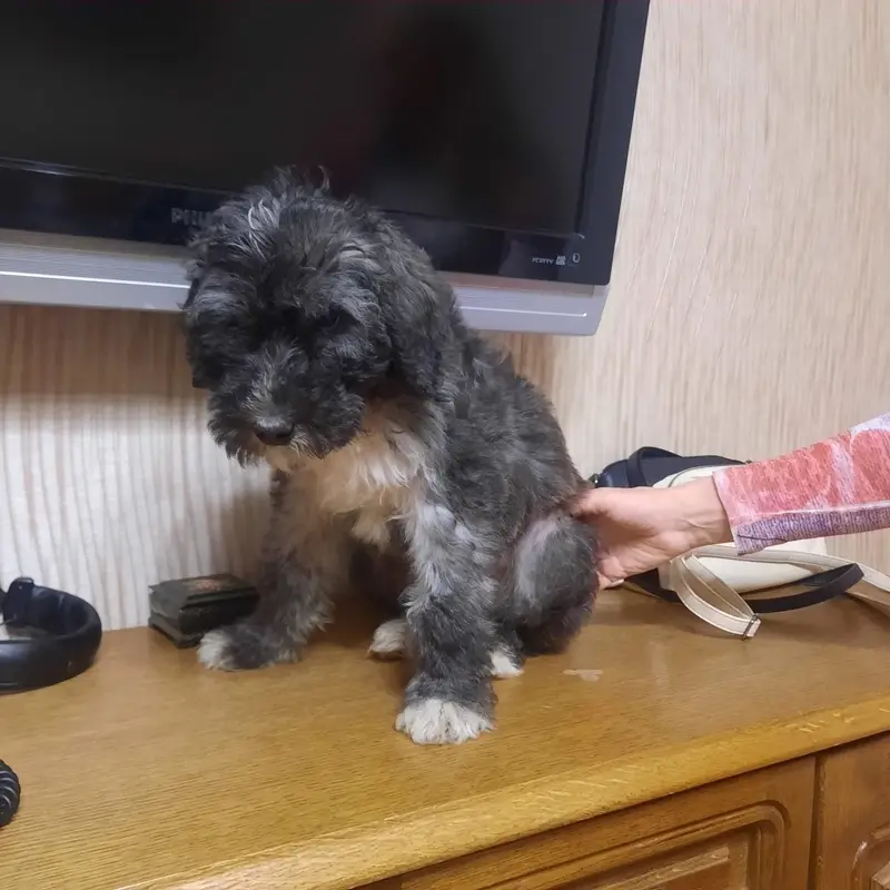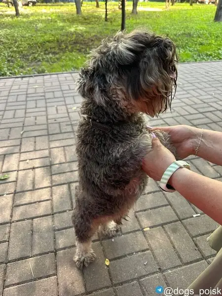 Метис шнауцера. Девочка. Большие пушистые уши, окрас черный с белыми лапами. Размер чуть больше среднего. На ней розовый адресник и красный поводок. Отзывается на кличку Мотя.
