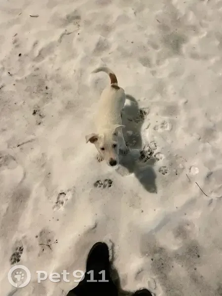Щенок (девочка) породы Джек Рассел, белого цвета, на хвосте коричневое пятно, на брюшке татуировка в виде номера. Потерялась ночью 01.01 около 00:30. Была в свитере, что на фото. Откликается на имя Мия.