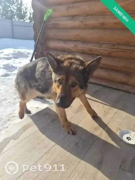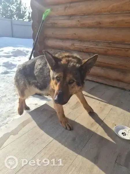 Черный с рыжим метис между дворнягой и овчаркой с ошейником с маленьким замком