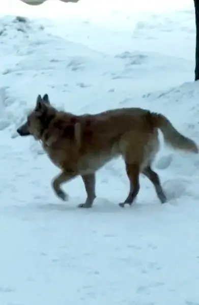 Светло-рыжая,мордочка черная с проседью,седые ресницы.В светлом,бежевом биотановом ошейнике . Испугалась,сорвалась с поводка и побежала в сторону театра Бабкиной.