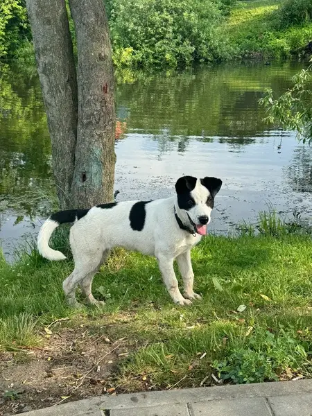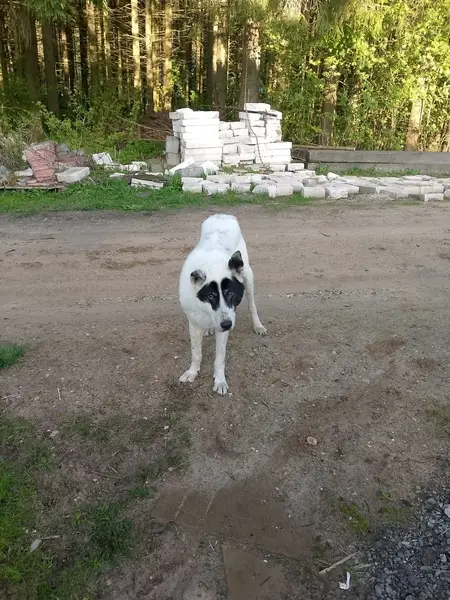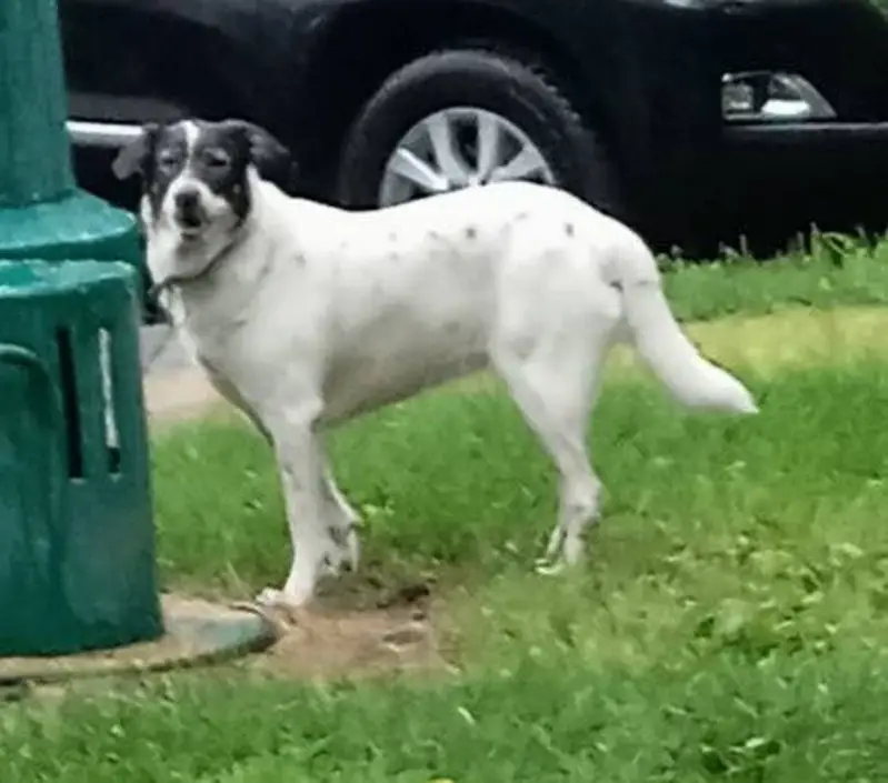 Белый с черным пятном на морде.Молодой щенок ,10 месяцев. Без ошейника.Вырвался из ошейника .