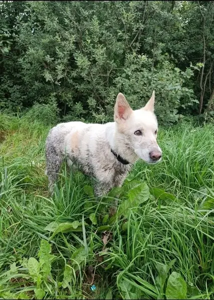 Метис, крупная белая девочка, серая спинка, на шее ярко-розовый адресник. Напугана, если заметите, не пытайтесь её поймать.