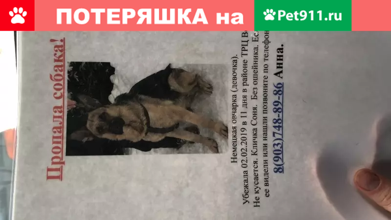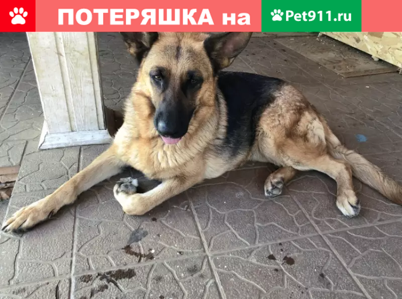 Немецкая овчарка (девочка) 3,5 года, не кусается, кличка Соня, без ошейника, черно-рыжая с проседью, сейчас худее, чем на фото.