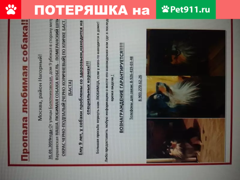 Город Москва, район Нагорный. 31.01.2019г. от улицы Болотниковская, дом 9 убежал в сторону метро Варшавская. Кобель, кличка Баст (Баста), померанский шпиц, окрас черно-подпалый ( чёрно-коричневый), не кастрирован. 9 лет, проблемы со здоровьем, находится на спец. Кормах. Просьба сообщить любую информацию о его местонахождении. Возможно у Ваших соседей появилась похожая на нашего любимца собака - при сборах на улицу очень звонкий!