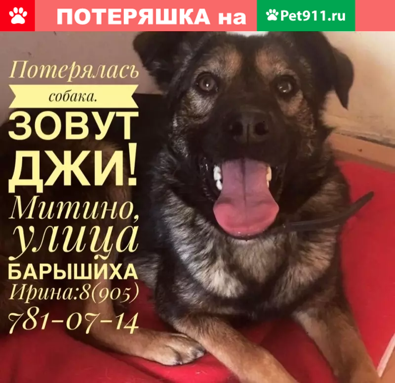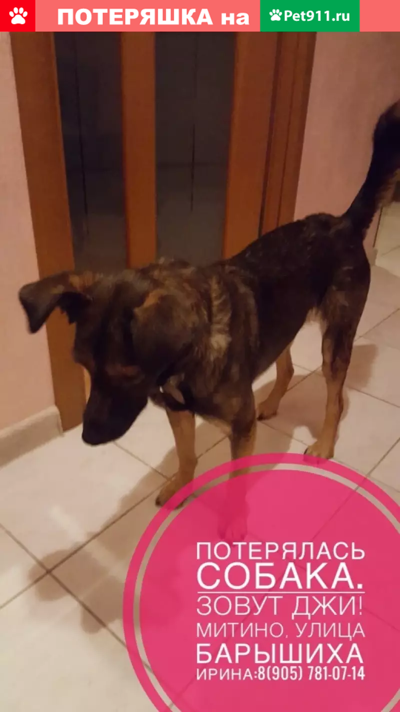МИТИНО, Москва Потерялась собака!!! 04.03 убежала собака в Красногорский лес, улица Барышиха. Сегодня (05.03) около 12:00 видели дворники в том же районе. Зовут Джи (девочка), была в голубом ошейнике, очень контактная собака. Невысокая, чуть ниже колена, окрас темный, лапы посветлее, висячие ушки, глаза карие. Просьба всех кто видел или имеет какую-то информацию связаться по номерам ниже. Джи очень ждут домой. Помогите найти!!! Ирина: Полина: