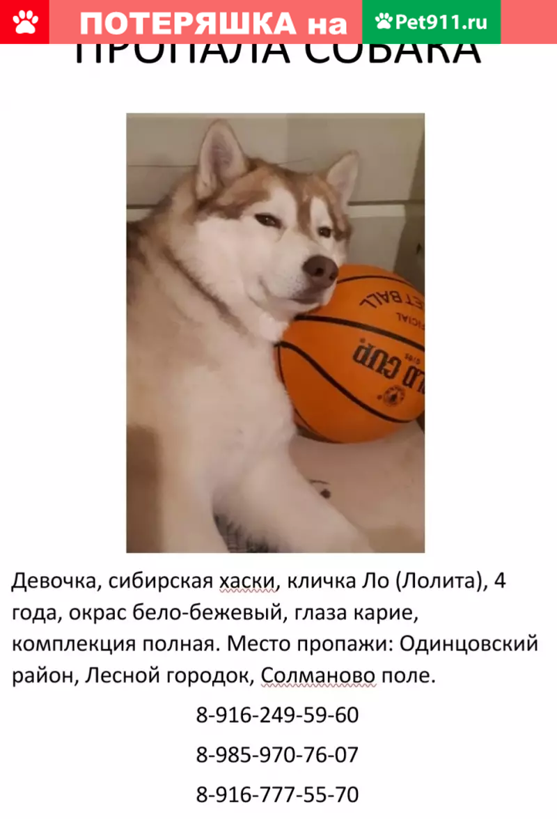 Хаски, девочка, 4 года по кличке Ло бело-бежевого окраса, полной комплекции убежала днем 20.03.19 в районе станции Лесной Городок, Одинцовский район МО. 21.03 была замечена в электричке в сторону Москвы. Предположительно выбежала на платформе Мичуринец или Очаково