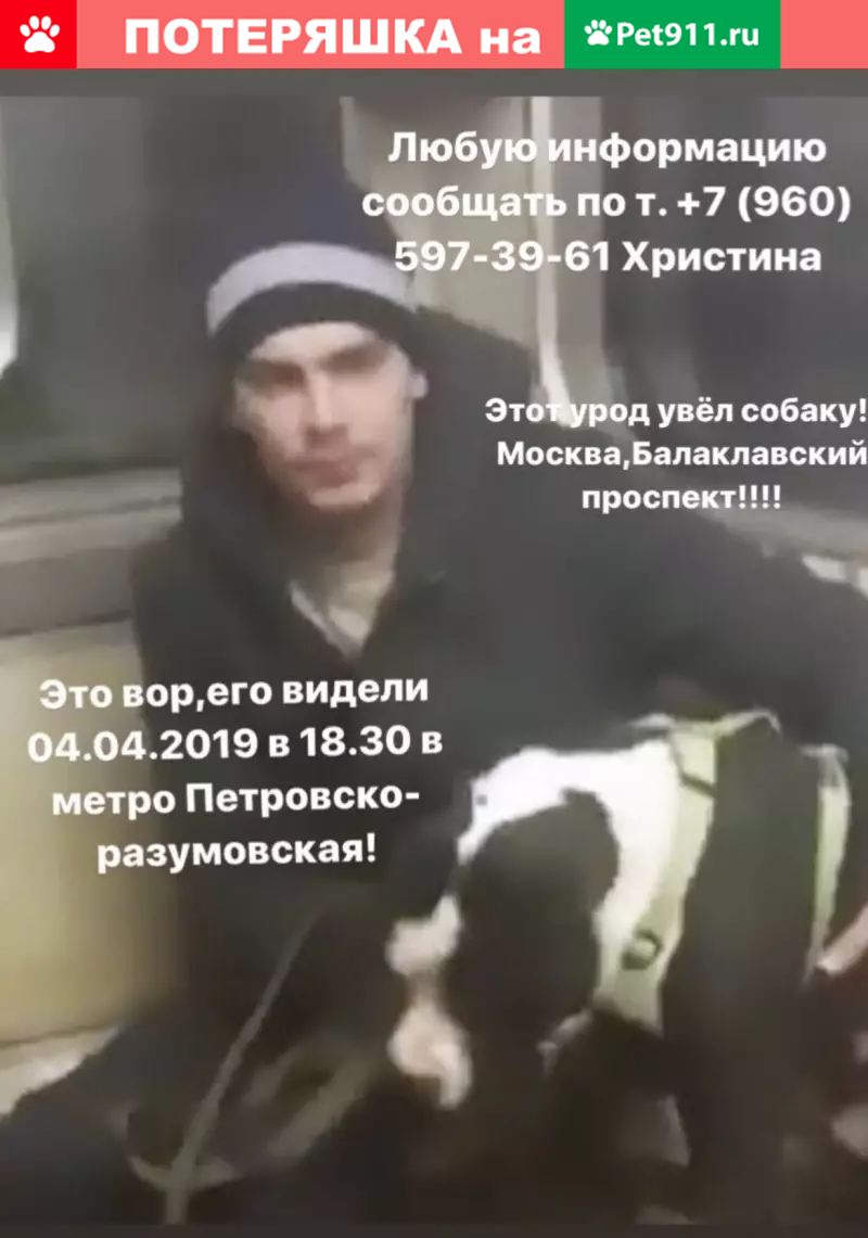 30. 03. 2019 Украли американского стаффордшир терьера, кобель чёрно-белый 1, 5 года. Кличка Гордон, есть клеймо в паху. Украли в Москве, Балаклавский проспект! Собаку видели в метро 04. 04. 2010 на Пертрвско-разумовской с похитителем, дальше след теряется! Клеймо в паху