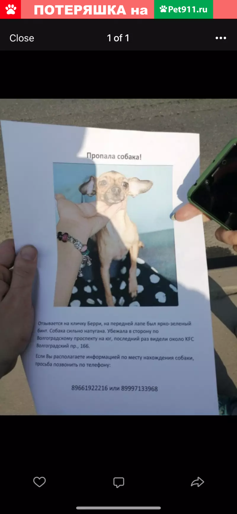 Пропала собака! Сбежала из Ивц МВА. Маленькая рыжая Собачка, похожа на русского той терьера (сука). Делали мрт, была пол наркозом. Особые приметы ярко зелёный бинт на ножке. Она не ручная и агрессивная к чужим людям, врачи не смогли ее удержать и она убежала на улицу. Может быть в районе Кузьминки- Выхино. Пожалуйста, если нашли, свяжитесь со мной по телефону. Она член семьи, без не можем. - 8-999-713-39-68 Алиса. 8-909-974-02-01 Тимур
