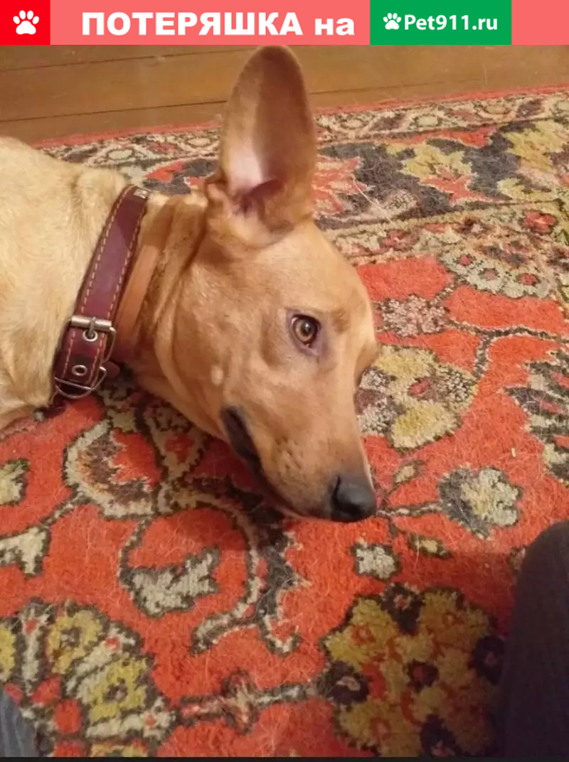 Утром 22. 04. Убежала собака, самка около полутора лет, около 20 кг, рыжая, гладкошерстная, одно ухо стоит, другое висит. Может откликаться на кличку Белка. На ней только противоблошиный ошейник.