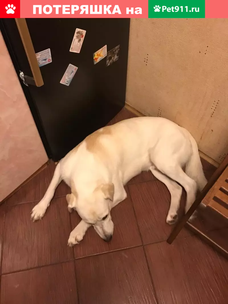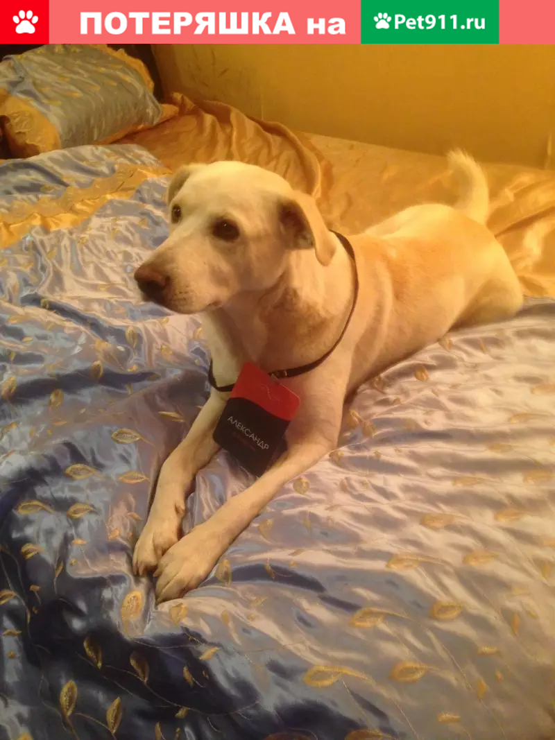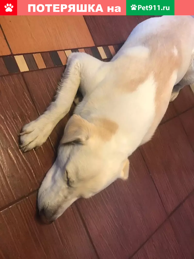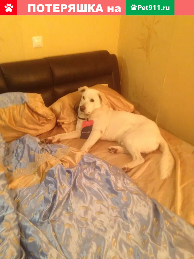 Метис, мальчик, кличка Снежок, белый с желтыми подпалинами, 2 года 4 месяца, на спине ближе к хвосту характерная белая запятая, на животе пупочная грыжа около 2 см, на боковой части правой задней ноги нет кусочка шерсти (след от пореза примерно 1см на 4см), вес 26 кг, в холке около 60 см Пропал в лесу в районе деревни Никитское, сельское поселение Бужарово, Истринский район.