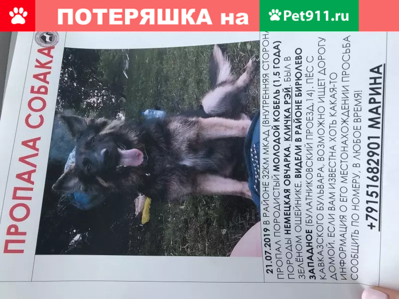 Молодой кабель (1,5года) немецкой овчарки. Кличка Рэй. Был в зеленом ошейнике. Видели в районе Бирюлево-Западное. На контакт не идёт , очень напуган , по слухам - хромает