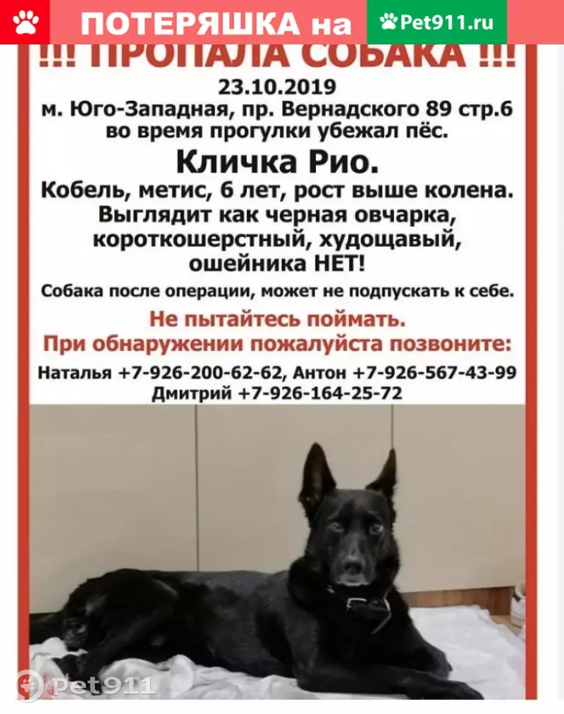 Дома❗️❗️❗️❗️ 23 октября сбежала во время прогулки из клиники «Медвет» по адресу: пр. Вернадского 89к6. Мальчик, метис, 6 лет, без ошейника. Полностью чёрный, худощавый, очень похож на чёрную немецкую овчарку, кличка Рио. Собака после операции, очень напугана, может кусаться. Будем благодарны любой информации о нашем питомце! Может быть в любом районе ЮЗАО. Последний раз собаку видели в Коньково! Звоните в любое время: +7-926-200-62-62 - Наталья, +7-926-164-25-72 - Дмитрий, +7-926-567-43-99 - Антон.