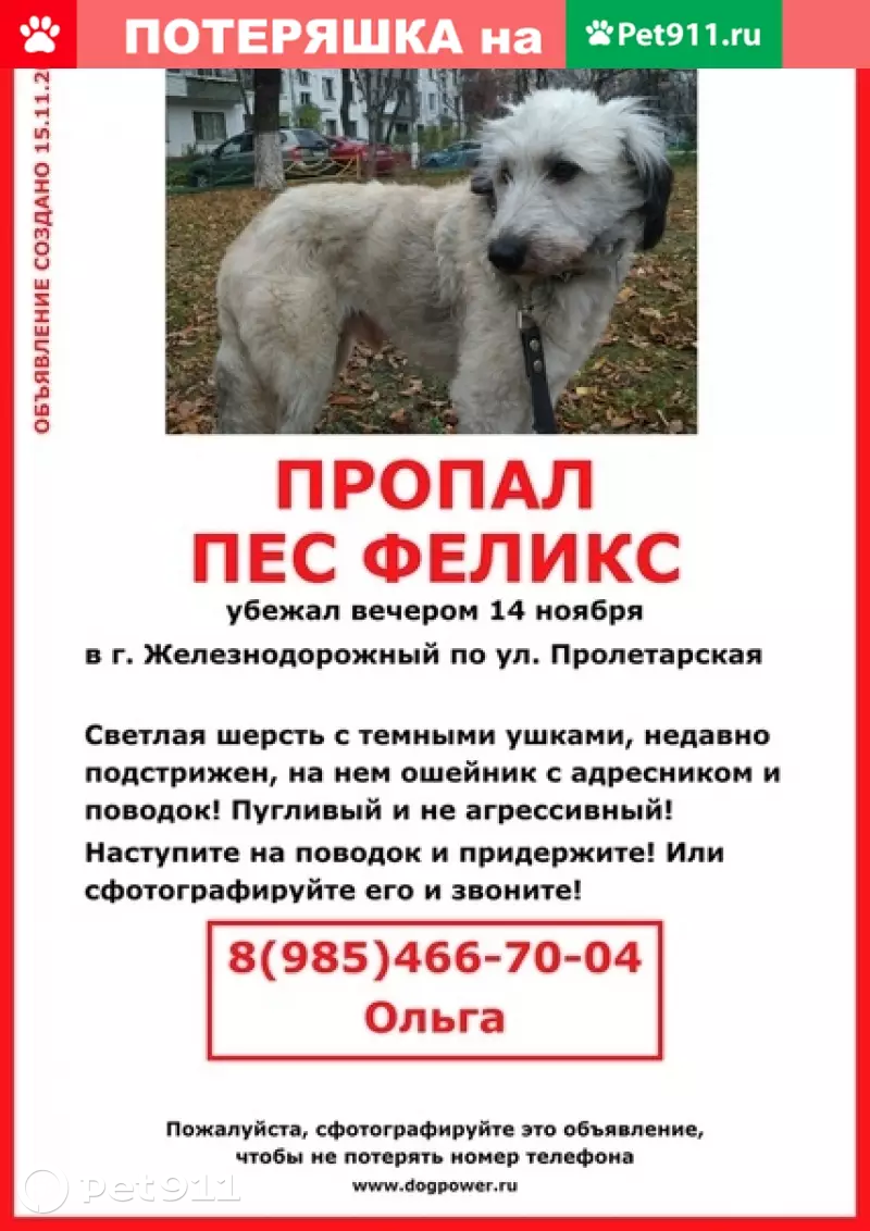 Вы не видели этого пса? (Серый терьер среднего размера) Сейчас может быть где угодно. Убежал в Железнодорожном, видели в Балашихе, Старой Купавне, Кудиново. Убежал Феликс (14 ноября)! На нем ошейник с адресником и поводок, который выскользнул из руки хозяйки. Если вы увидите Феликса - сфотографируйте его и сразу звоните! Не пугайте, не гоняйтесь за ним, попробуйте подманить едой и постарайтесь взять поводок. Или хотя бы проследите, куда он пойдет. Телефон хозяйки - 8(985)466-70-04 Ольга