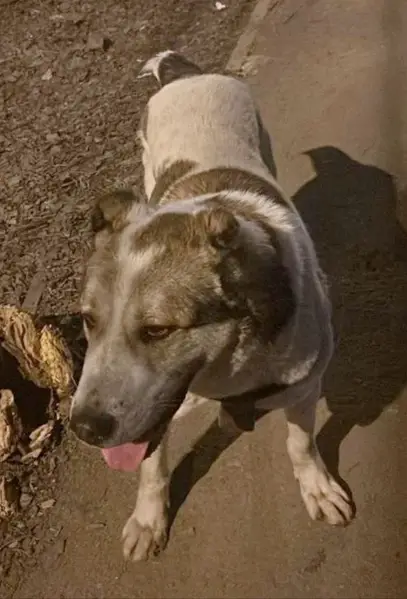 Купированы уши, белый с коричневым пятном на глазу.