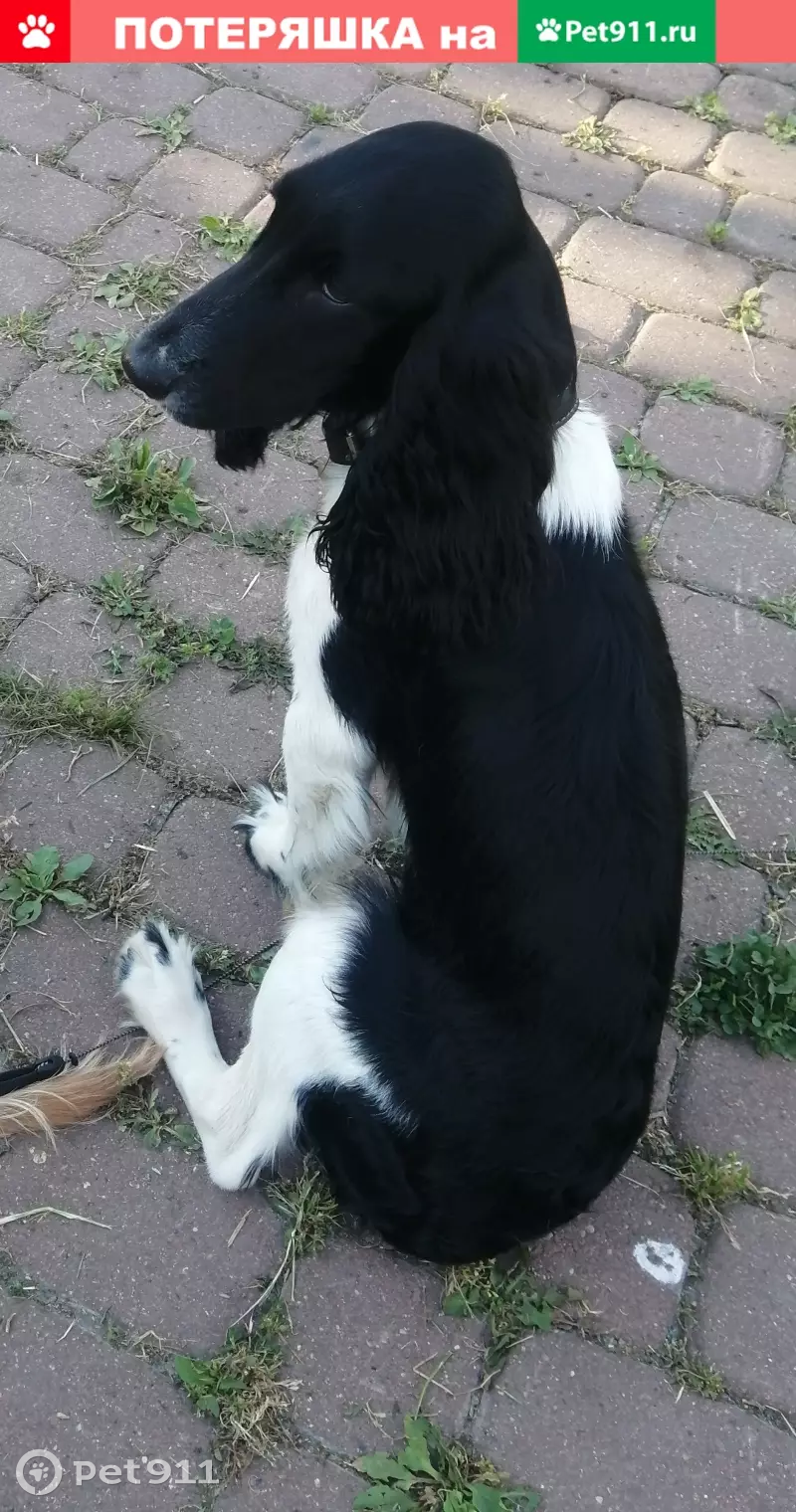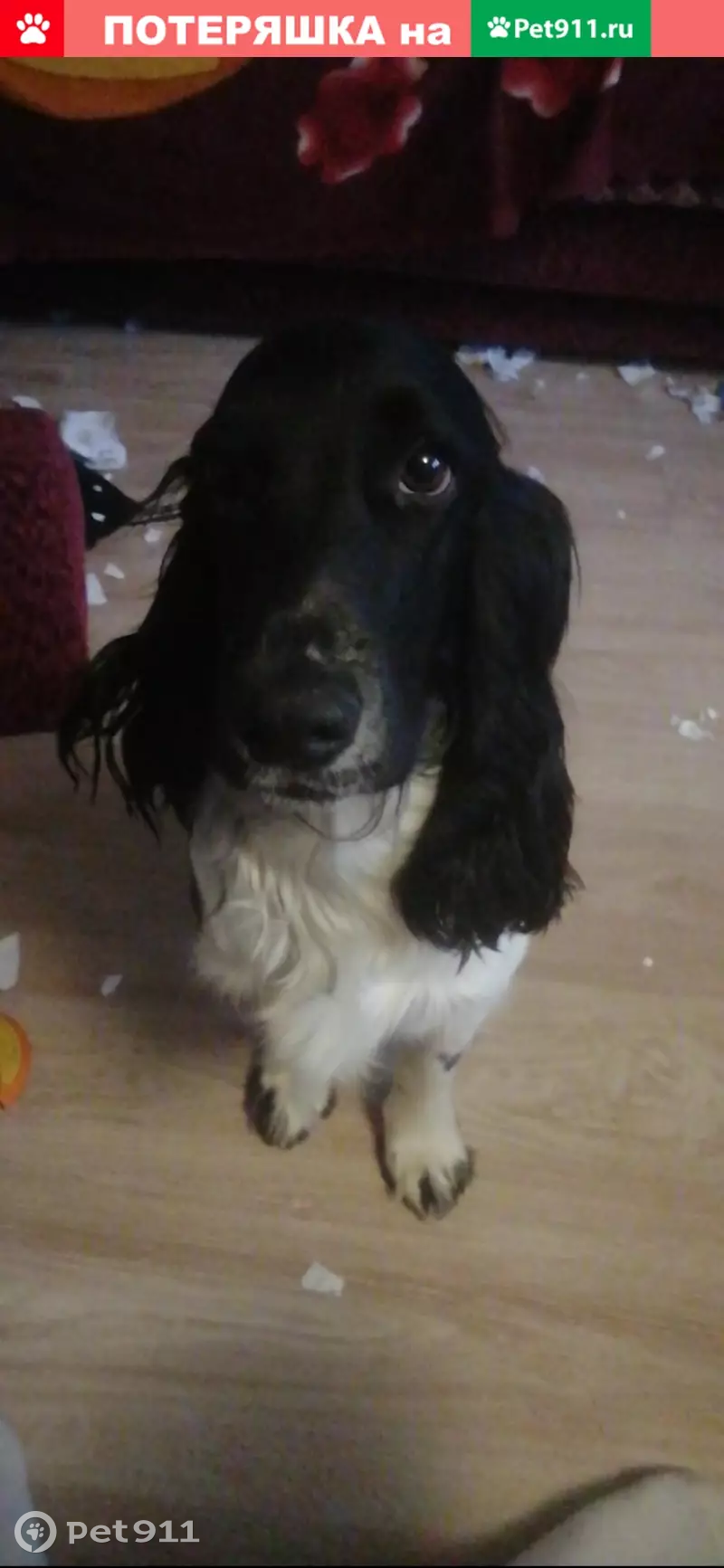 Русский спаниель. Кобель, 9 мес. Трусливый. Белые животик, грудка и лапки, голова и спинка черные. На нем ошейник с адресником и фонариком. Так же, обрывок поводка.