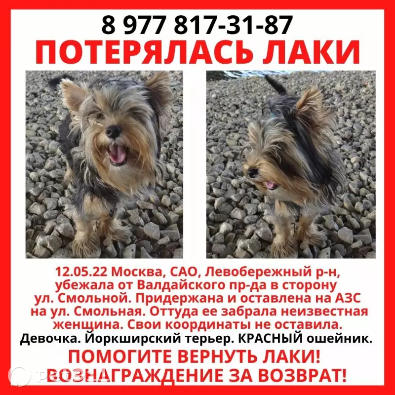 Москва, САО пропала собака 12.05,последний раз видели на заправке на пересечении Смольной улицы и Прибрежного проезда, далее её забрала неизвестная женщина, не оставив своих данных, Просьба вернуть собаку, ей требуется лечение и её очень ждут дома