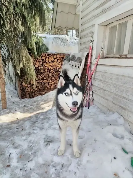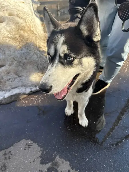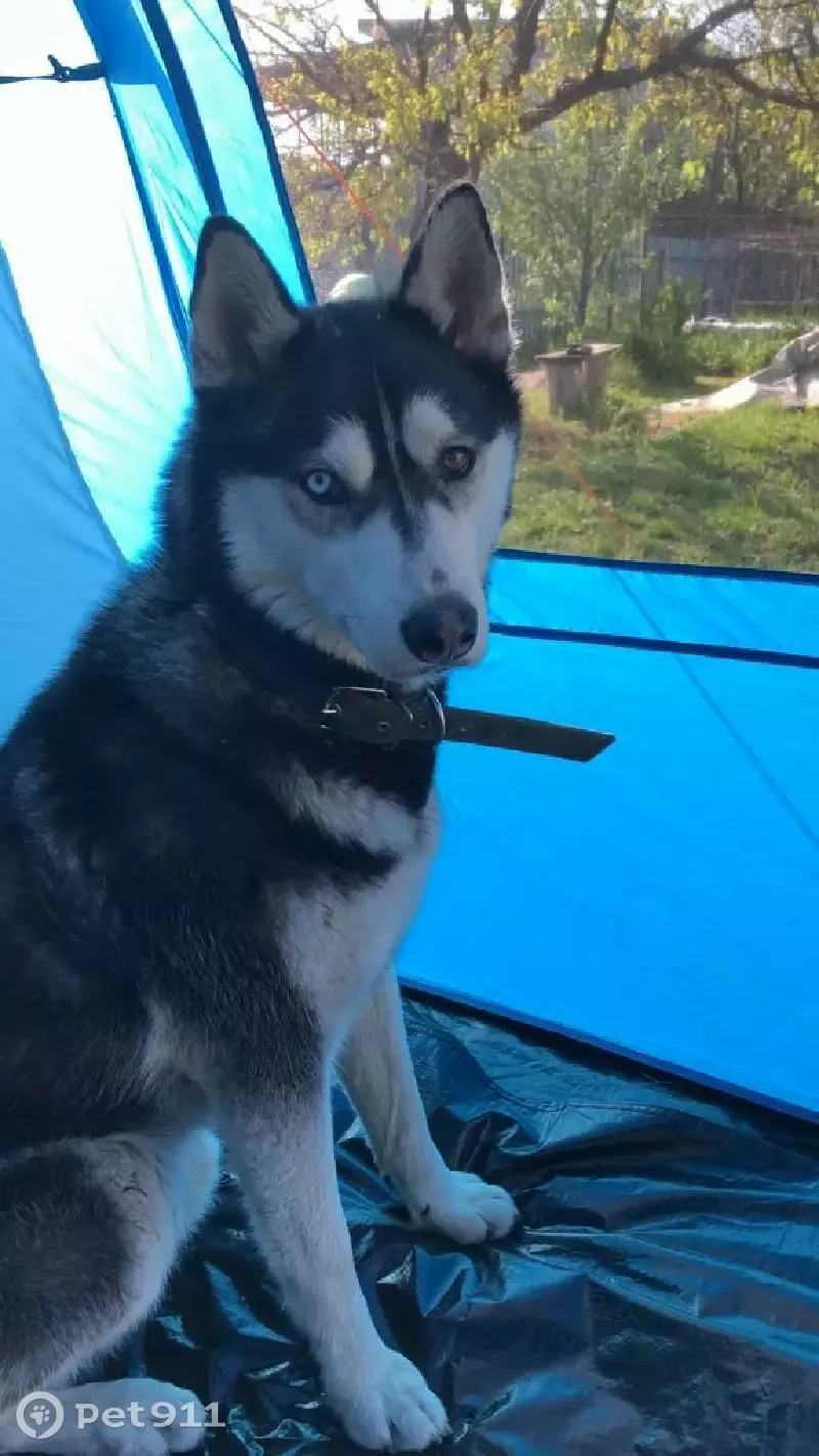 Хаски сибирская мальчик кличка Зевс на нём два ошейника зелёный и серый от блох, носик чёрный с розовым разные глазки голубой и карий. Очень доверчивый к людям ему 4 года.