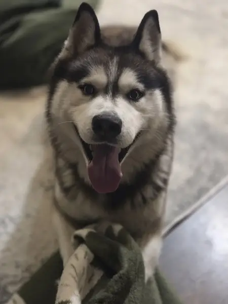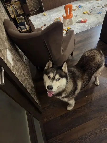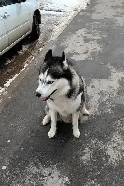 Зовут Рич порода хаски выбежал из подъезда на нём одет ошейник на ошейнике есть номер телефона ещё ошейник от блох серого цвета