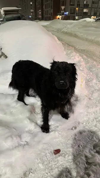 Тибетский мастиф чёрного цвета кабель , ошейник тканевый , кличка Блэк , к людям близко не подходит , лает , ушел через лес с участка