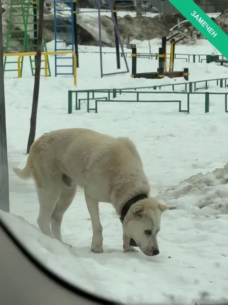 Девочка белого окраса среднего размера, молоденькая, пугливая, зовут "Баффи" на ошейника