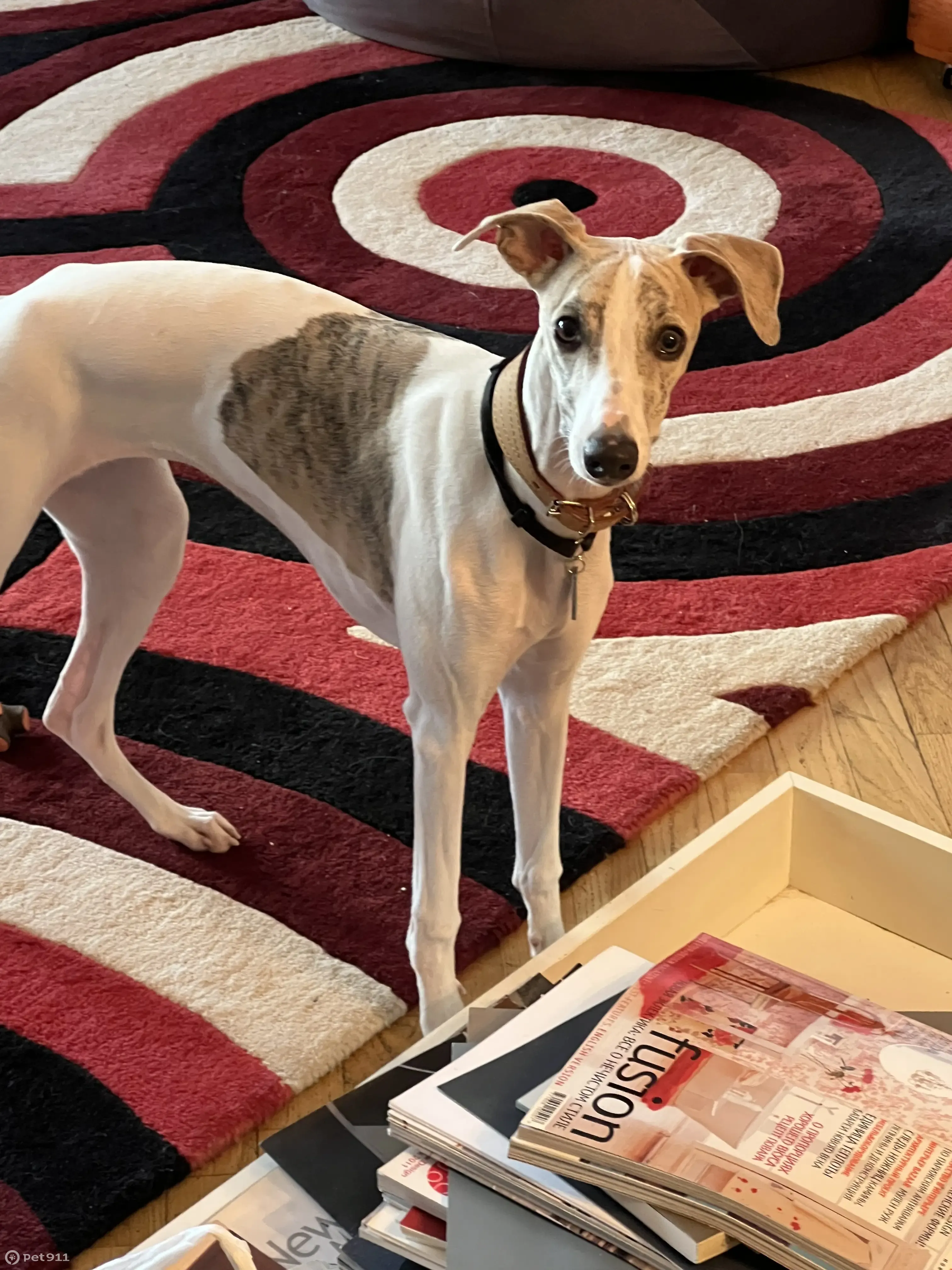 Девочка. Кличка выбита на брелке на ошейнике (фото). Потерялась в тех ошейниках как на фото. Окрас белый с бежевыми пятнами. Играла с собаками на лужайке и сорвалась, убежала.