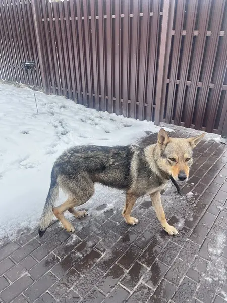 Девочка, стерилизована, жёлтая бирка на правом ушке, дворняга, серо-коричневая с подпалами.