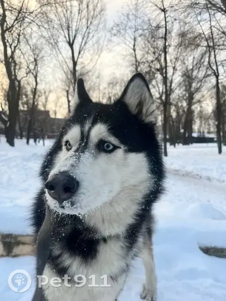 Мальчик, окрас черный-белый, хаски, сорвался с поводка. Он знает команды и обучен.